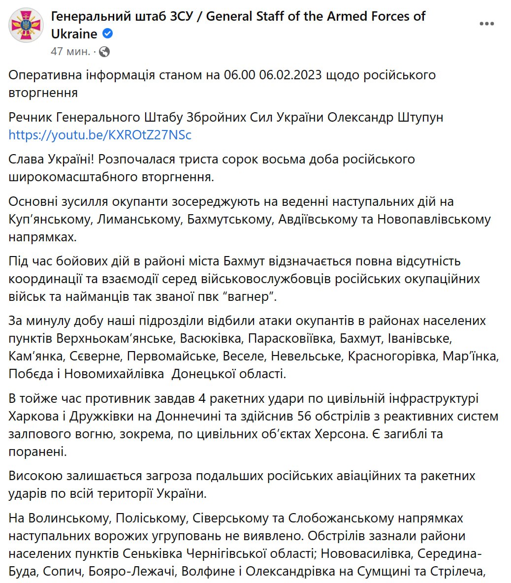 Війна в Україні триває вже 348 день. Ми стежимо за новинами 6 лютого у своєму онлайні.