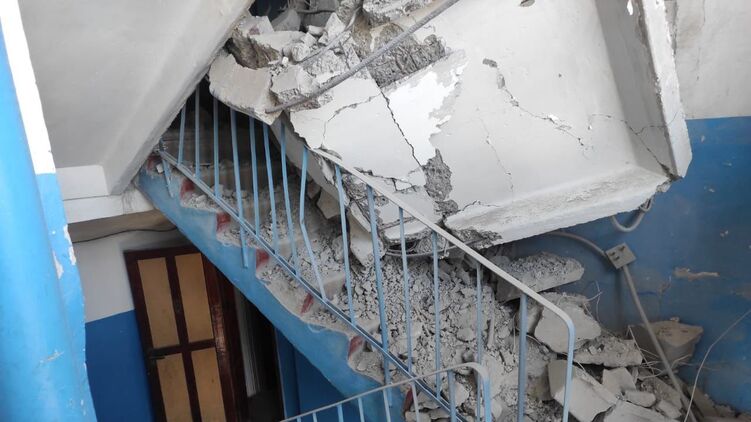 Повністю зруйновано сходові прольоти між 9 та 6 поверхами, пробито стіну, у більшості квартир вибито вікна, повідомляють у Донецькій ОДА.