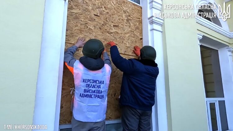 Ремонт вікон залізничного вокзалу в Херсоні, який постраждав через обстріл РФ. Скріншот відео