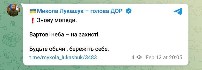 22:09 Командування Повітряних сил України спростовує інформацію щодо застосування «шахедів» увечері 12 лютого на Дніпропетровщині.