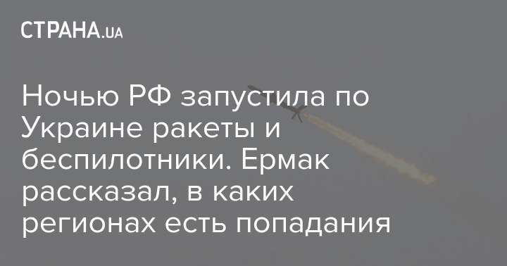 Глава Офісу президента Андрій Єрмак повідомив, що вночі росіяни запускали по Україні безпілотники та ракети. В результаті зафіксовано попадання у кількох регіонах України.