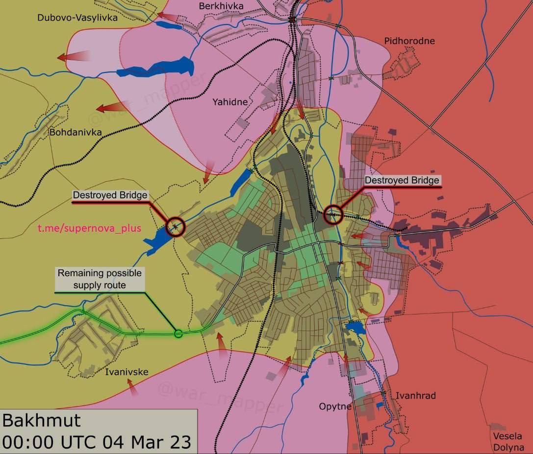 "Запобіжна руйнація мостів, ймовірно, вказує на те, що українські війська можуть спробувати перешкодити пересуванню росіян у східній частині Бахмуту та обмежити потенційні шляхи виходу росіян з Бахмуту на захід", - йдеться у звіті.