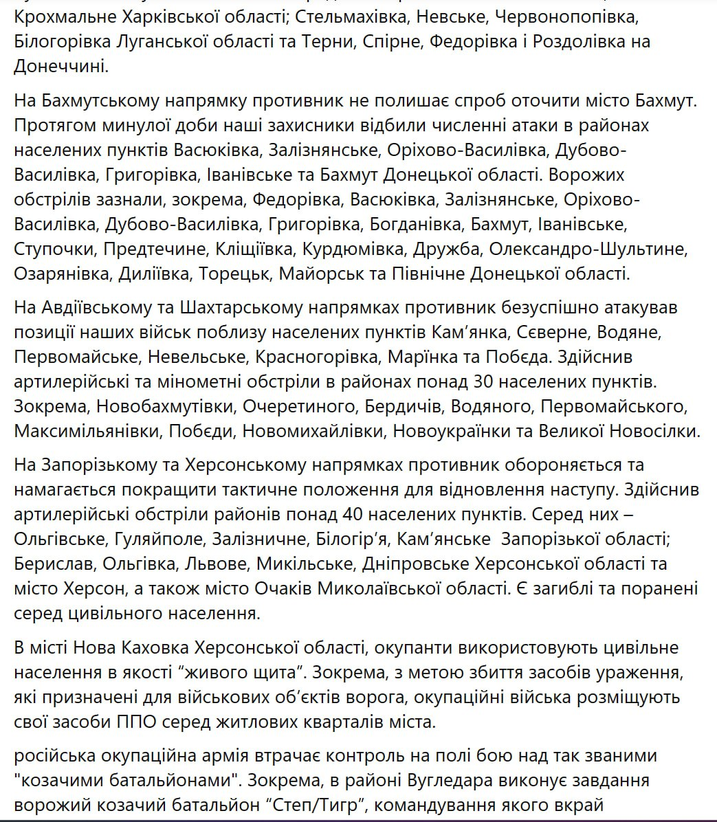 2. Противник не залишає спроб оточити Бахмут. Минулої доби там відбито численні атаки в районах Васюківки, Залізнянського, Оріхово-Васильівки, Дубово-Васильівки, Григорівки, Івановського та самого Бахмута. На Авдіївському та Шахтарському напрямках - поблизу населених пунктів Кам'янка, Північний, Водяний, Першотравневий, Невельський, Красногорівка, Маринка та Перемога.