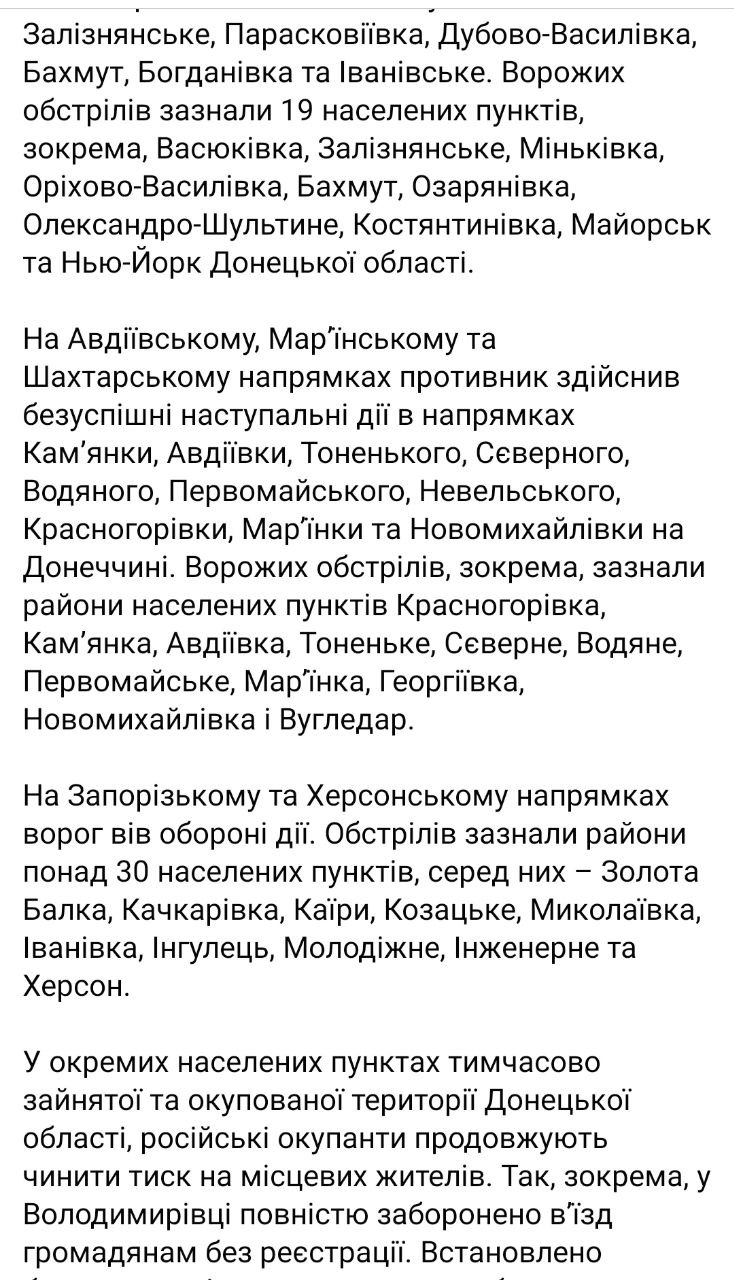 На Авдіївському, Мар'їнському та Шахтарському напрямках – у районах Кам'янки, Авдіївки, Тонечкого, Північного, Водяного, Первомайського, Невельського, Красногорівки, Мар'їнки та Новомихайлівки.