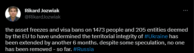 "Дію санкцій буде продовжено щодо 1473 фізичних та 205 юридичних осіб, більшість із яких потрапили під обмеження у відповідь на невиправдану та неспровоковану військову агресію Росії проти України, яка триває", - оголосила Рада ЄС.