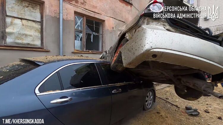 Херсонська ОВА публікує відео наслідків вчорашнього обстрілу медустанови в Херсоні, де внаслідок удару з безпілотника вибухом одну машину закинуло на іншу.