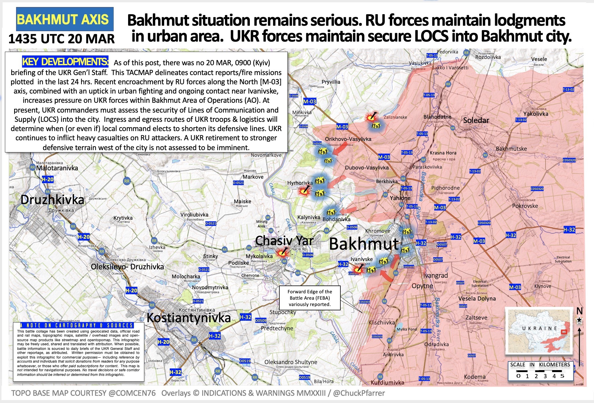 Тим часом куратор ПВК "Вагнер" Євген Пригожин стверджує, що станом на 20 березня росіяни контролюють 70% території Бахмуту. Україна таких даних не підтверджує.