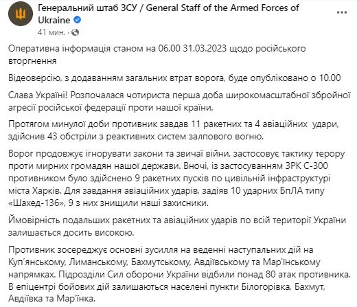 У п'ятницю, 31 березня, Генштаб ЗСУ оприлюднив зведення про ситуацію на фронті минулої доби.