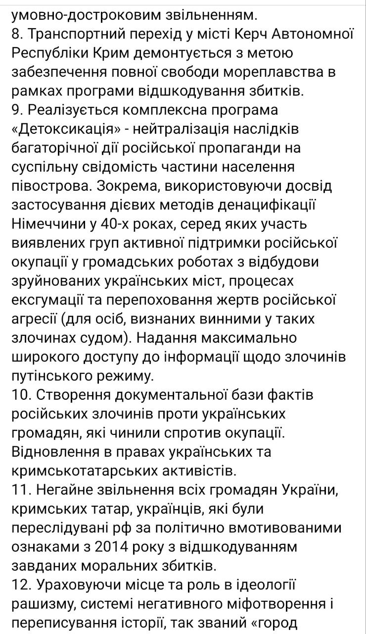 Інші пункти стосуються притягнення до відповідальності в українських судах винних у колабораціонізмі чи інших злочинах. А також звільнення політв'язнів.
