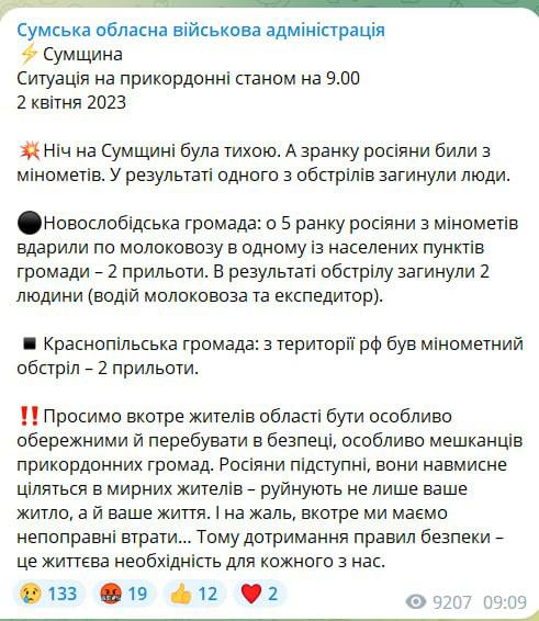 "Новослобідська громада: о 5 ранку росіяни з мінометів ударили по молоковозу в одному з населених пунктів громади – 2 прильоти. Внаслідок обстрілу загинули 2 особи (водій молоковозу та експедитор)", - йдеться у повідомленні.