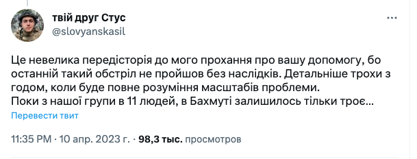 "Вже кілька тижнів регулярні війська зі своїми "Півонями" рівні все, що мало хоч якусь форму та цілісність. Поки з нашої групи в 11 осіб, у Бахмуті залишилося лише троє", - написав учора у Твіттері український боєць з ніком "твій" друг Стус".