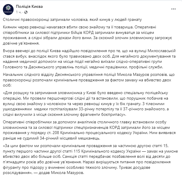 Киянин побачив на вулиці свою знайому з товаришем і кинув у їхній бік гранату. 33-річну потерпілу та її 37-річного знайомого з пораненнями відвезли до лікарні.