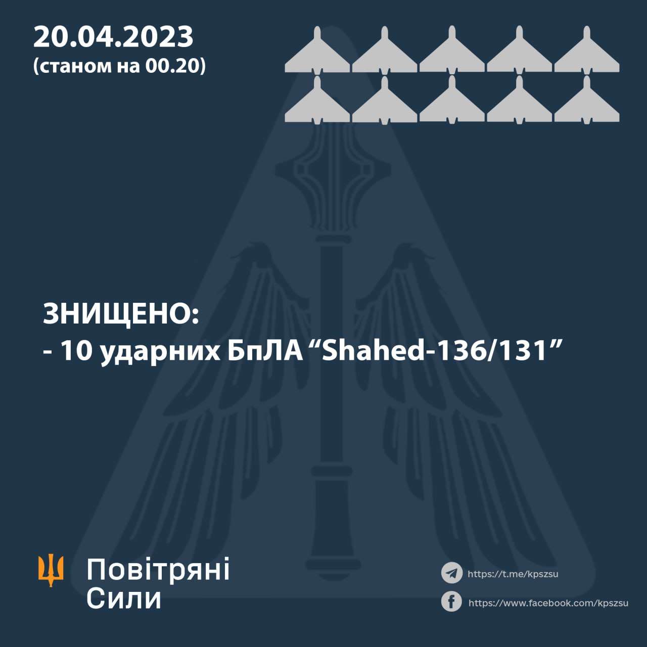 08.12 Повітряні сили України повідомляють, що цієї ночі збили 10 із 11 "Шахидів" на південно-східному напрямку.
