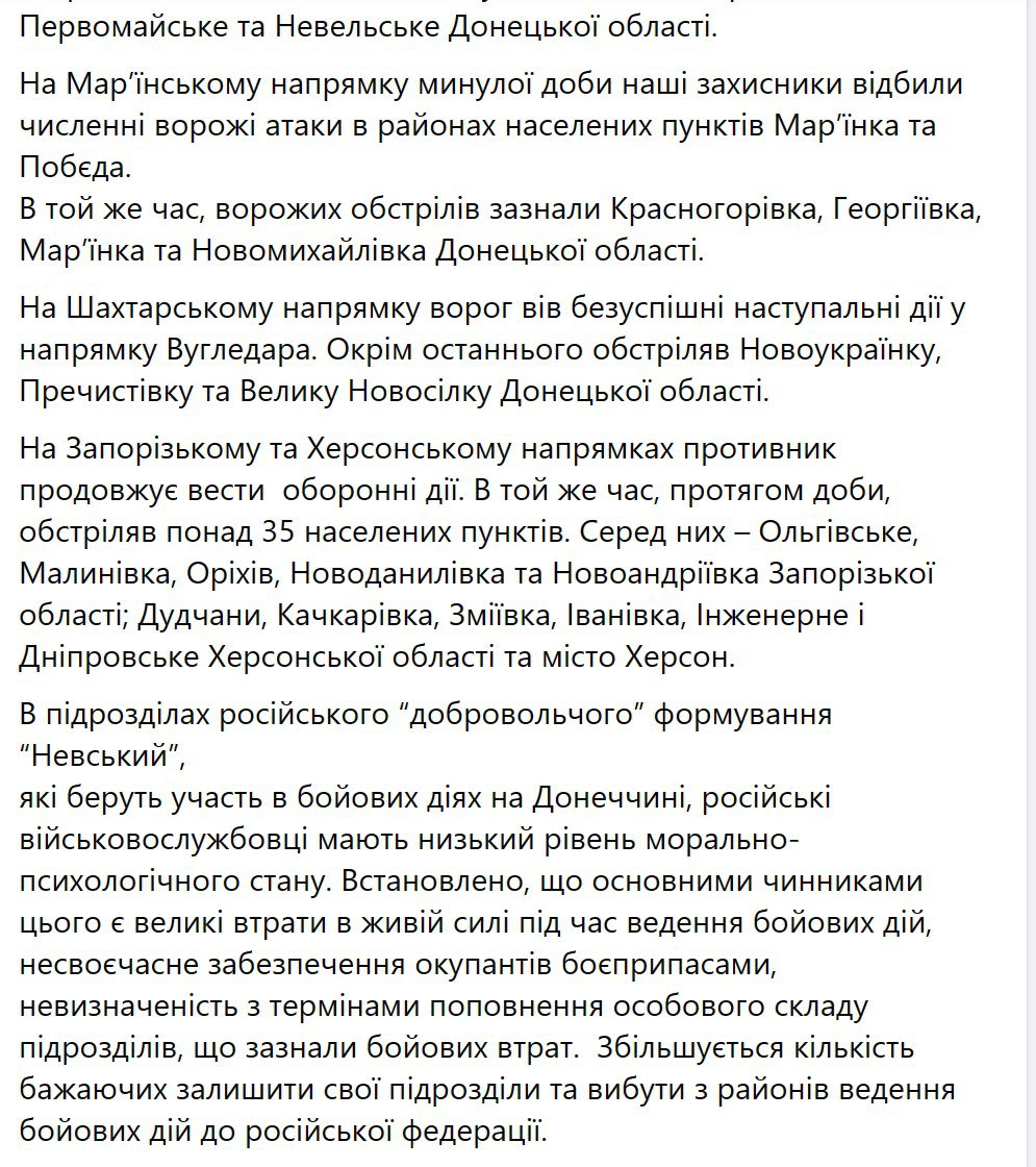 3. На Волинському, Поліському, Сіверському, Слобідському, Куп'янському, Запорізькому та Херсонському напрямах ситуація без істотних змін.