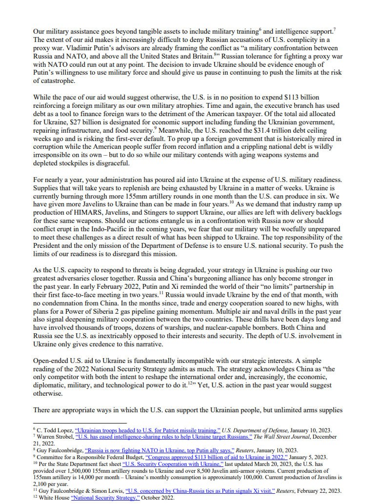 "Почався другий рік війни, але найближчого кінця не видно, як і немає чіткої стратегії, як її завершити. Маріонеткова війна (в оригіналі – proxy war) з Росією в Україні – не на користь США і загрожує ескалацією, яка може вийти з-під контролю", - пишуть автори листа, який підписали 19 осіб.