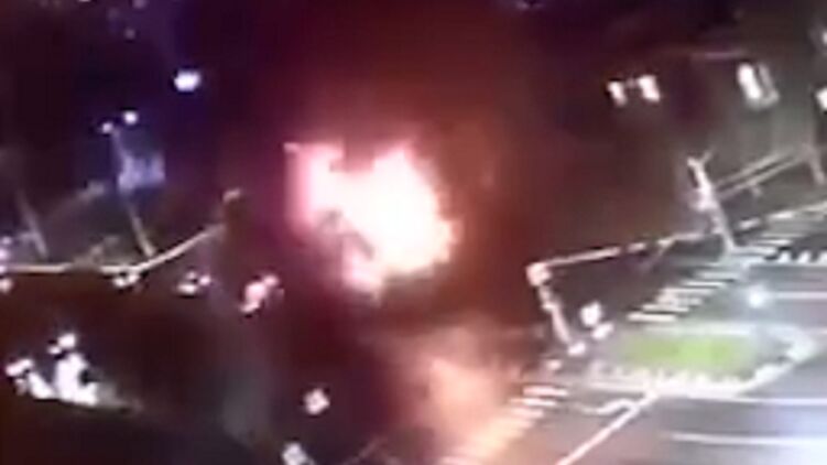 У момент падіння бомби на проїжджій частині була машина. Видно, що її буквально викидає вперед разом із асфальтом.