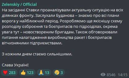 "Проаналізували актуальну ситуацію на всіх ділянках фронту. Заслухали Буданова – ми знаємо про всі плани ворога у найближчий період. Розробляємо ще якіснішу схему розподілу озброєння та боєприпасів по підрозділах, особливу увагу тут – новоствореним бригадам.