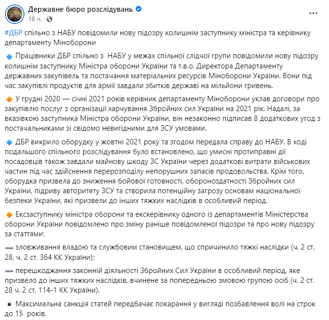 Нова підозра, оголошена ним учора, стосується статті про зловживання владою та службовим становищем, що спричинило тяжкі наслідки, а також перешкоджання законній діяльності Збройних Сил України в особливий період. Екс-чиновникам загрожує позбавлення волі на строк до 15 років.