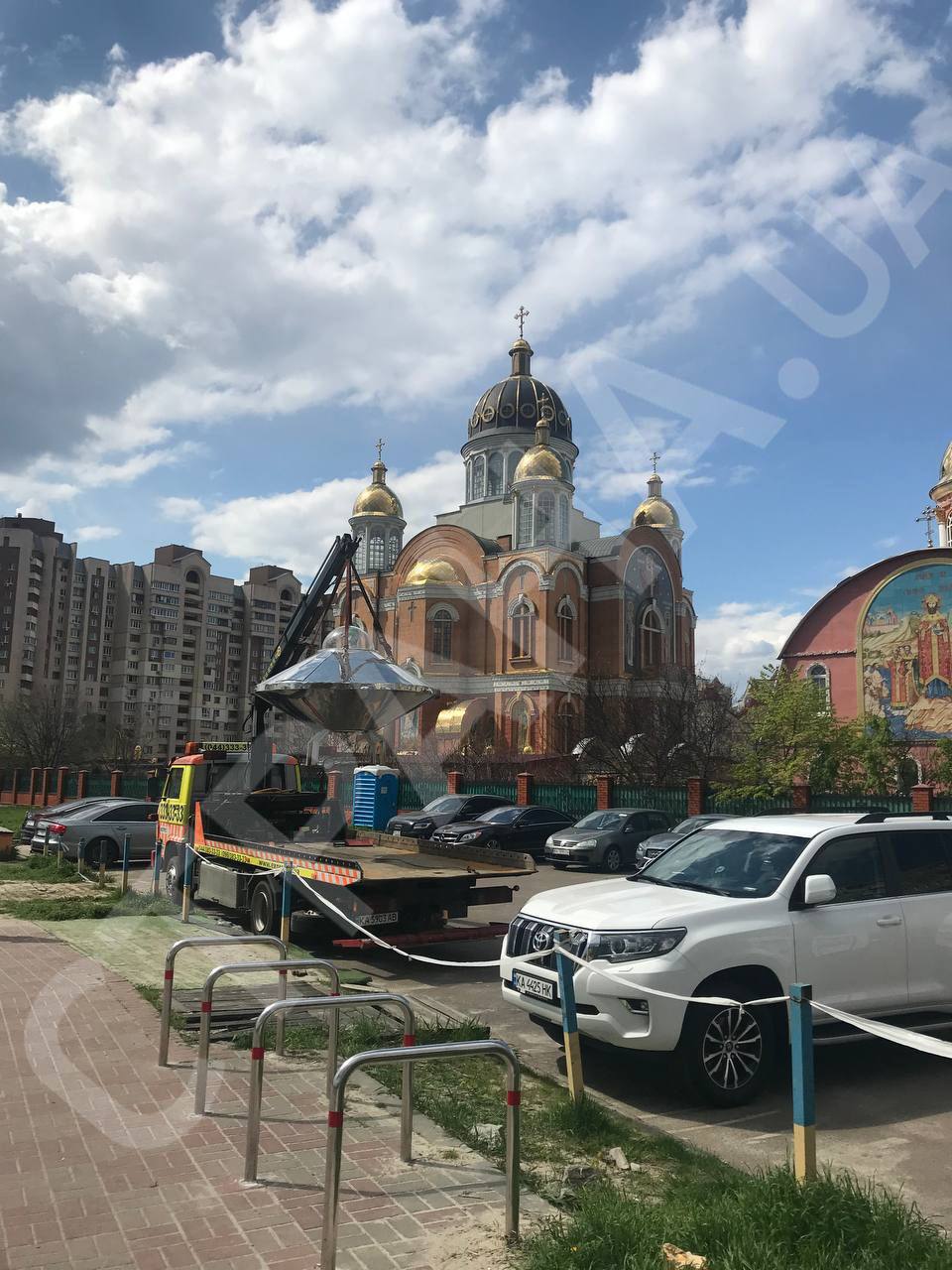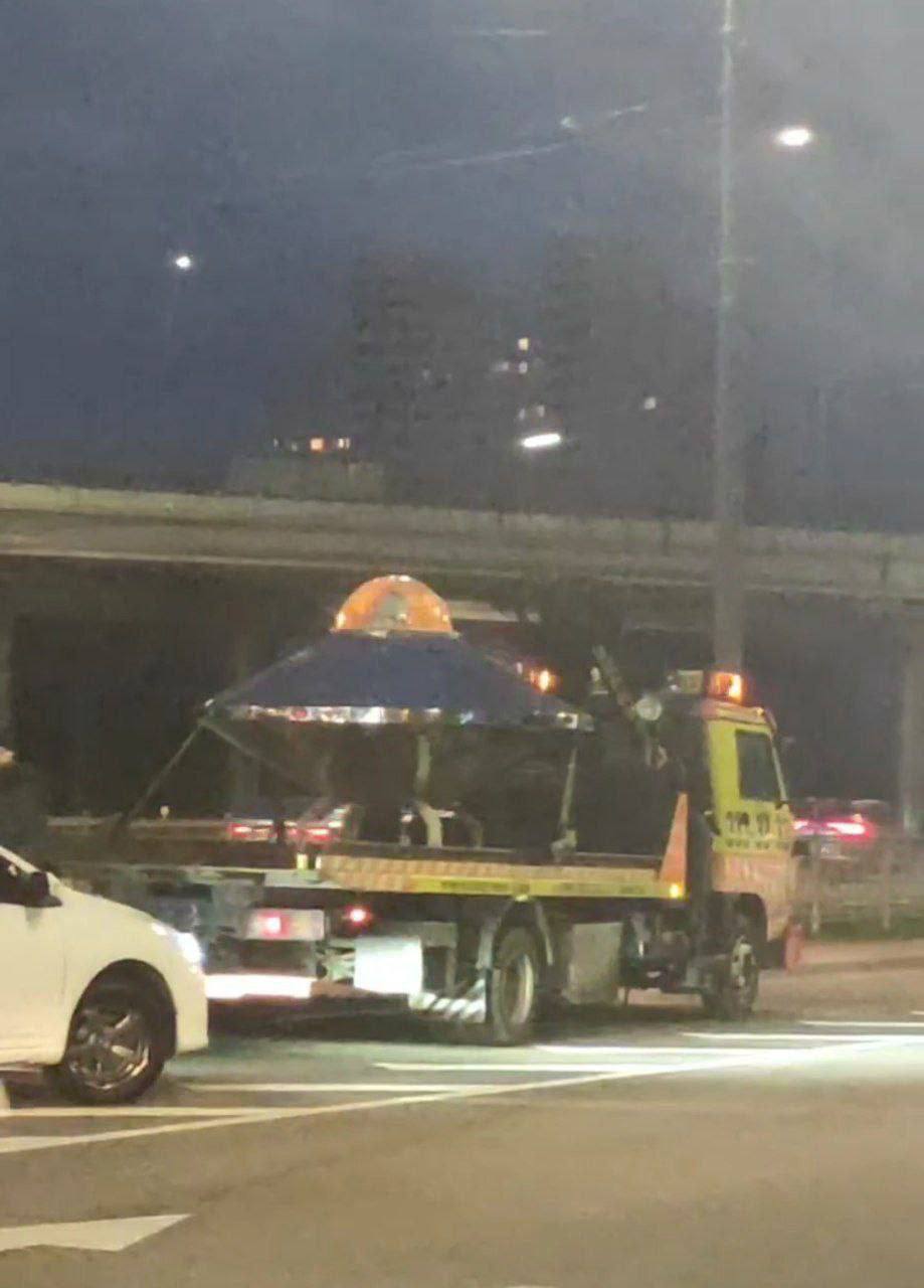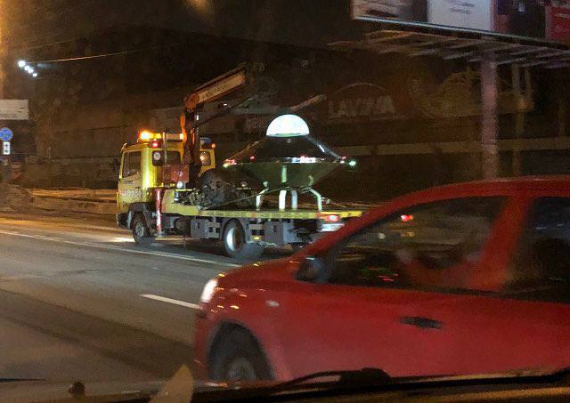 Літаюча тарілка, якою стала зіркою в київських телеграм-каналах у ніч дивного спалаху над столицею, зараз знаходиться на Оболонській набережній у Києві поряд із парком "Наталка". Там вона висить, прикріплена до стріли евакуатора.