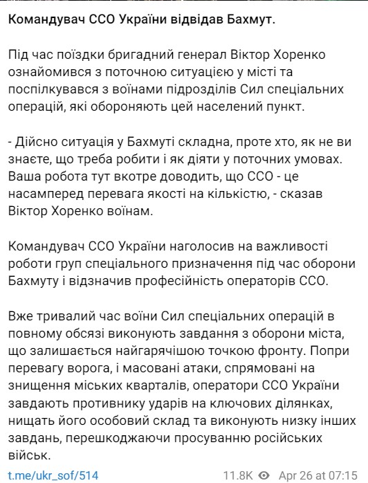 "Справді, ситуація в Бахмуті складна, проте хто, як не ви знаєте, що потрібно робити і як діяти в поточних умовах. Ваша робота тут ще раз доводить, що ССО - це насамперед перевага якості над кількістю", - сказав Віктор. Хоренко.