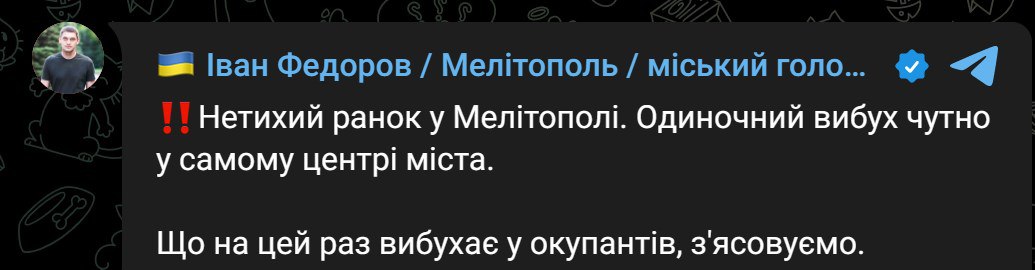 08.19 У центрі Мелітополя пролунав вибух, повідомив мер міста Іван Федоров.
