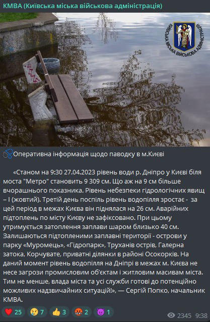 Аварійних підтоплень по Києву немає, зберігаються підтоплення на островах "Муромець", "Гідропарк", Труханові у Галерній затоці. у Корчуватому та на Осокорках.