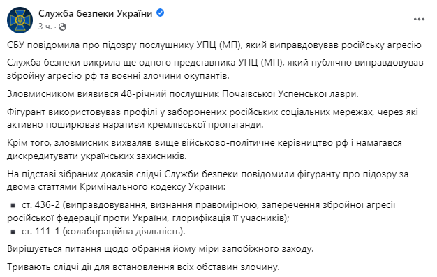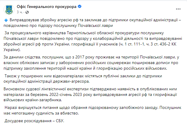 СБУ повідомила про підозру послушнику УПЦ із Почаївської Успенської лаври. Його підозрюють у виправданні російської агресії та закликах до колабораціонізму, який він публікував у закритих російських соцмережах.