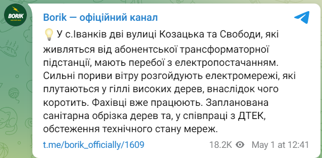 Про оперативну ситуацію повідомляють в офіційному Telegram-каналі Бориспільської громади Borik.