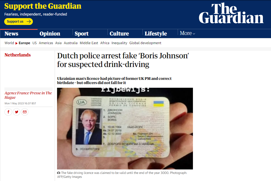 Автомобіль був кинутий, але згодом поліції повідомили, що водій стояв на мосту. Поліція попросила п'яного водія надати права. У відповідь 35-річний чоловік показав підроблений документ на ім'я екс-прем'єра Британії Бориса Джонсона, виданого в Україні.