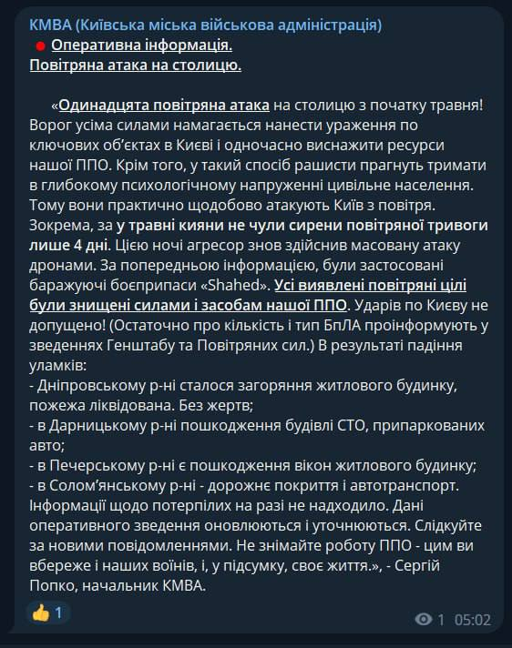 Цієї ночі росіяни атакували Київ дронами "Шахед", всі цілі були збиті. Є спалах від падіння уламків.