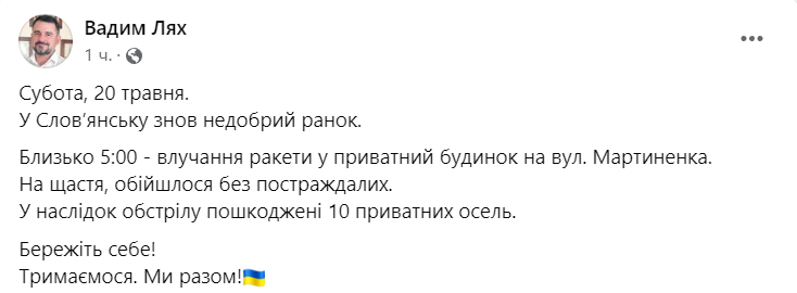 Наслідки ракетних ударів по Слов'янську. Фото: Facebook.com/Vadymlyakh/