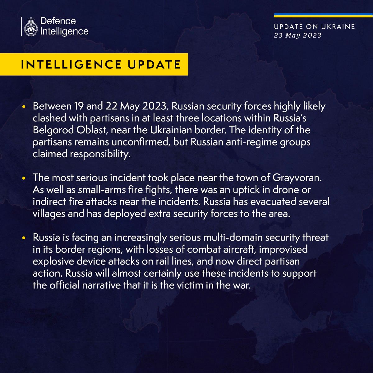 За її даними, у період з 19 по 22 травня російські сили безпеки, найімовірніше, зіткнулися з партизанами принаймні на трьох ділянках у Білгородській області неподалік кордону з Україною.