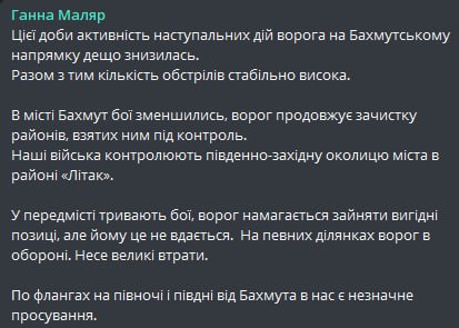 На флангах на півночі та півдні від Бахмута є незначний поступ українських військових, повідомила Маляр.