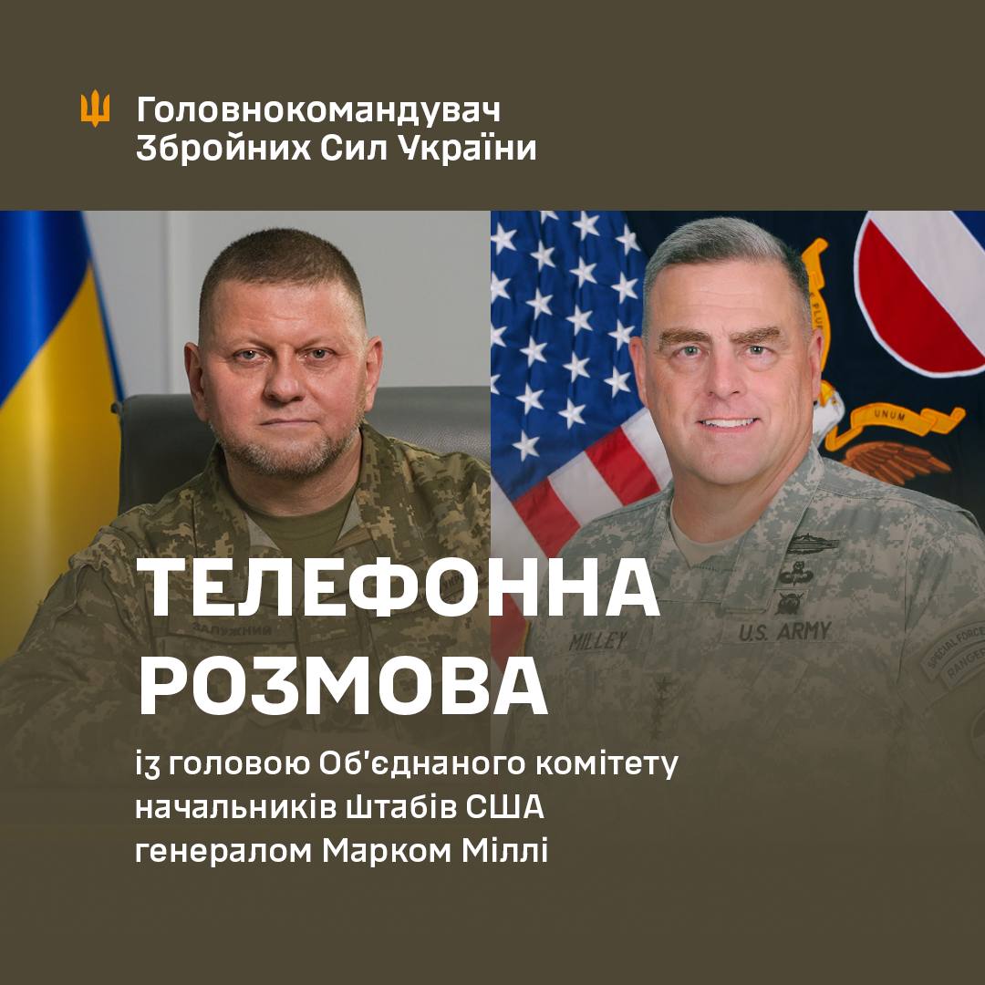 21.56 Головком ЗСУ Валерій Залужний поговорив телефоном головою Об'єднаного комітету начальників штабів США генералом Марком Міллі про плани українського наступу.