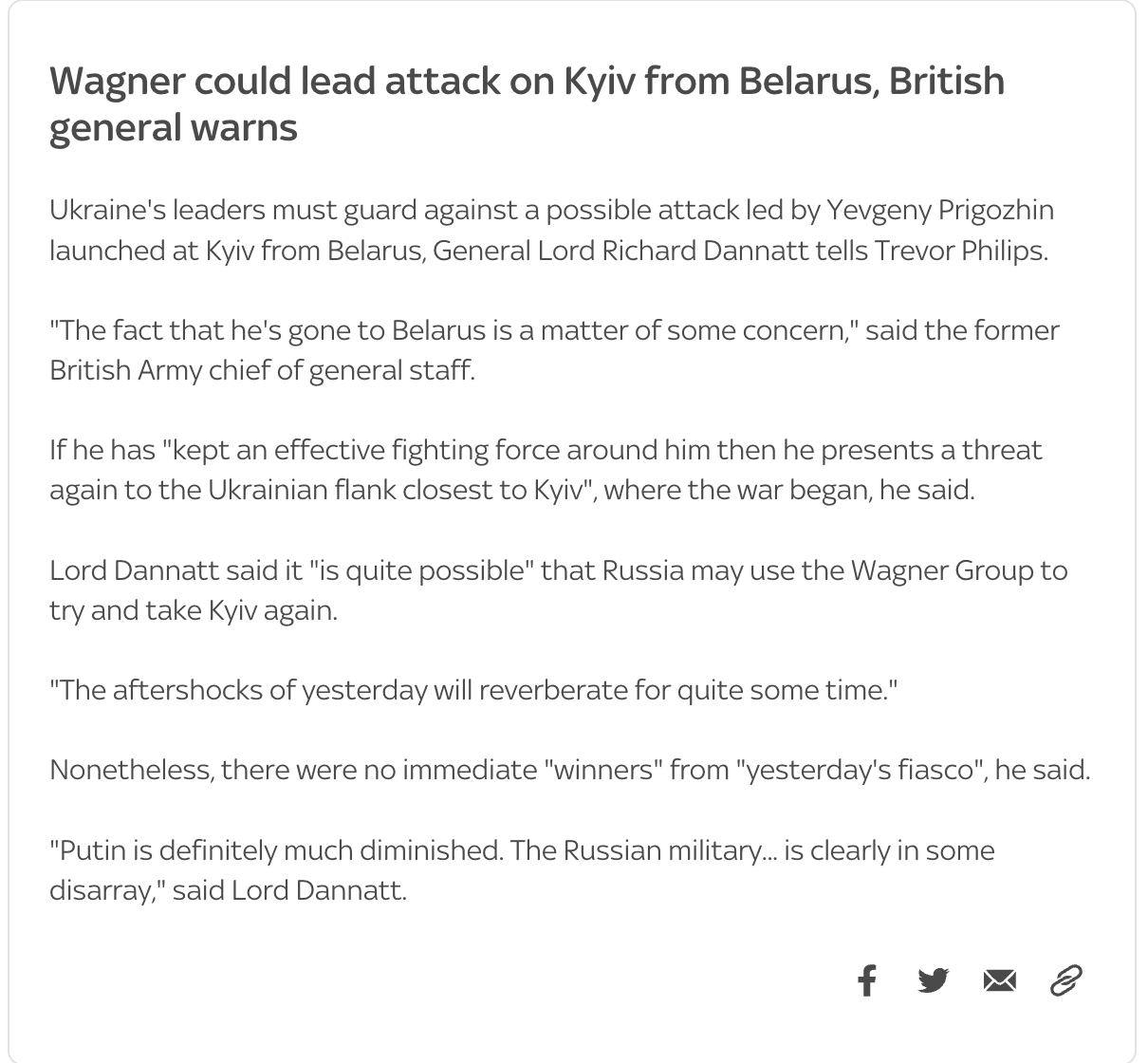 За словами Данната, якщо Пригожин "зберіг навколо себе боєздатні бойові сили, то він знову становить загрозу для українського флангу, найближчого до Києва".