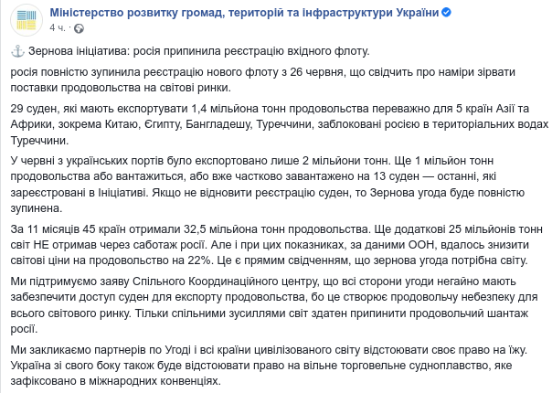 "РФ повністю зупинила реєстрацію нового флоту з 26 червня, що свідчить про її наміри зірвати поставки продовольства на світові ринки. 29 суден, які мають експортувати 1,4 мільйона тонн продовольства переважно для п'яти країн Азії та Африки, включаючи Китай, Єгипет, Бангладеш, Туреччину, заблоковані Росією у територіальних водах Туреччини", - йдеться у повідомленні.