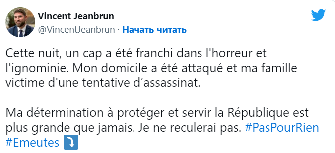 Мер Л'А-ле-Роз Вінсент Жанбрун написав у Твіттері, що протестувальники "протаранили машиною" його будинок, перш ніж "підпалити".