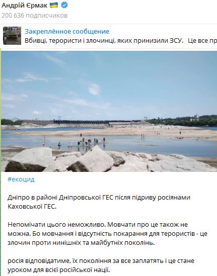 Глава Офісу президента Андрій Єрмак публікує фото, як зараз виглядає Дніпро у районі Дніпровської ГЕС на півночі Запоріжжя.