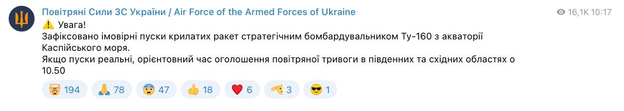 Якщо пуски реальні, орієнтовний час оголошення повітряної тривоги у південних та східних областях – 10:50.