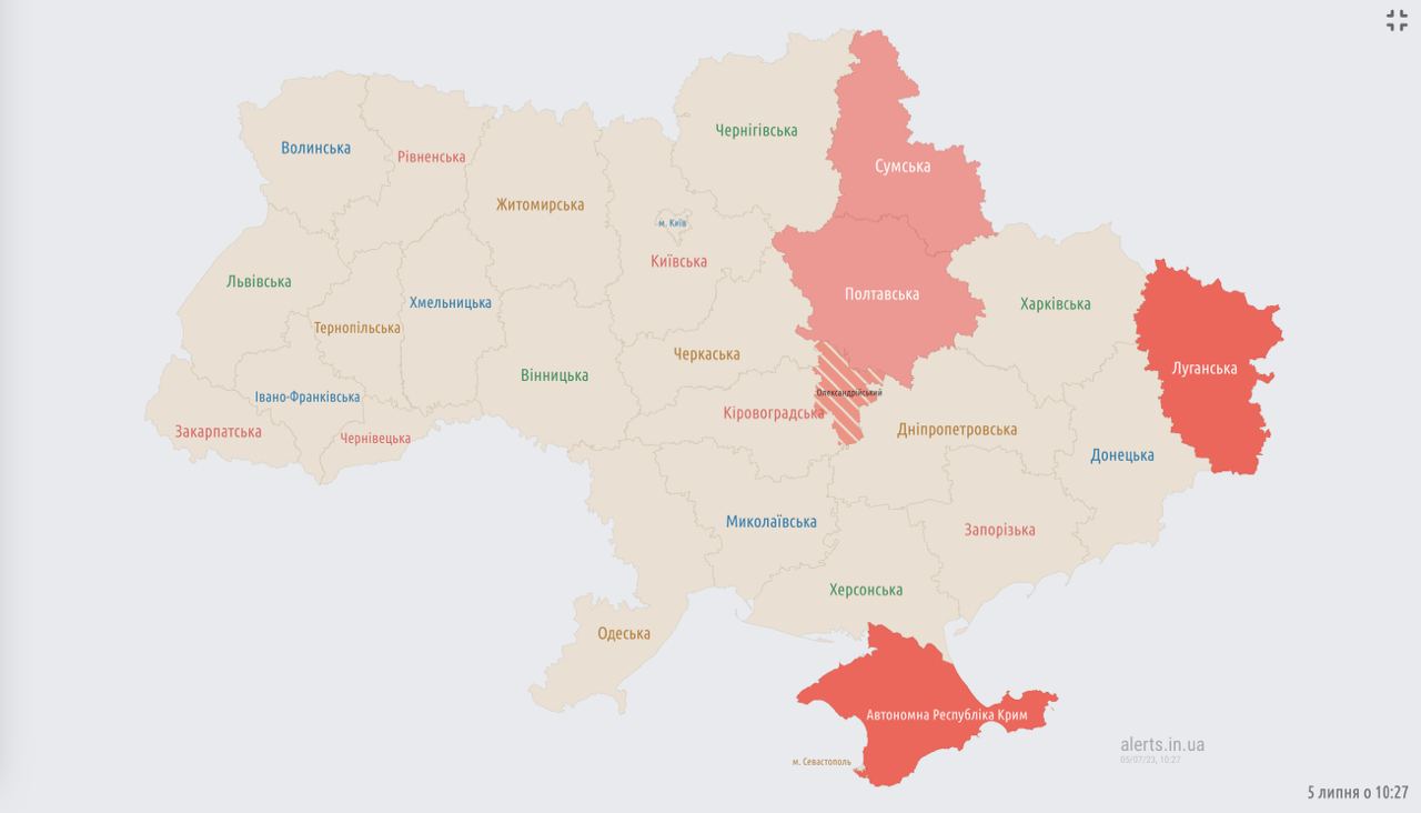 Небезпека ракетних ударів є у Сумській та Полтавській областях, попереджають Повітряні сили. Там оголошено повітряну тривогу.