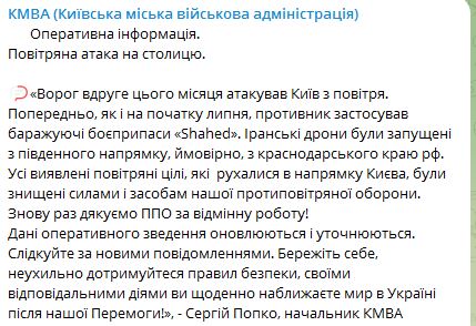 07.05 Вночі Київ зазнав повітряної атаки. Попередньо РФ випустила іранські дрони з південного напрямку, ймовірно, з Краснодарського краю Росії.