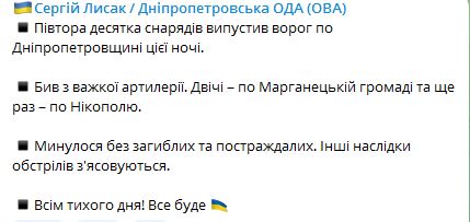 08.08 Вночі росіяни випустили півтора десятки снарядів Дніпропетровської області.