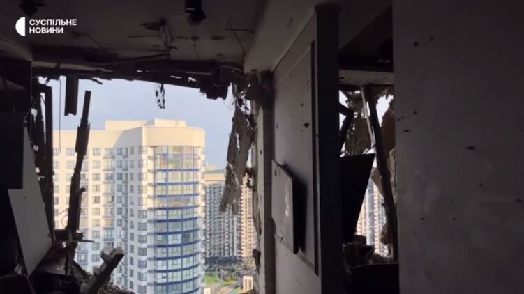 В Дарницькому районі Києва уламок збитого безпілотника пошкодив квартиру на 25 поверсі висотки.