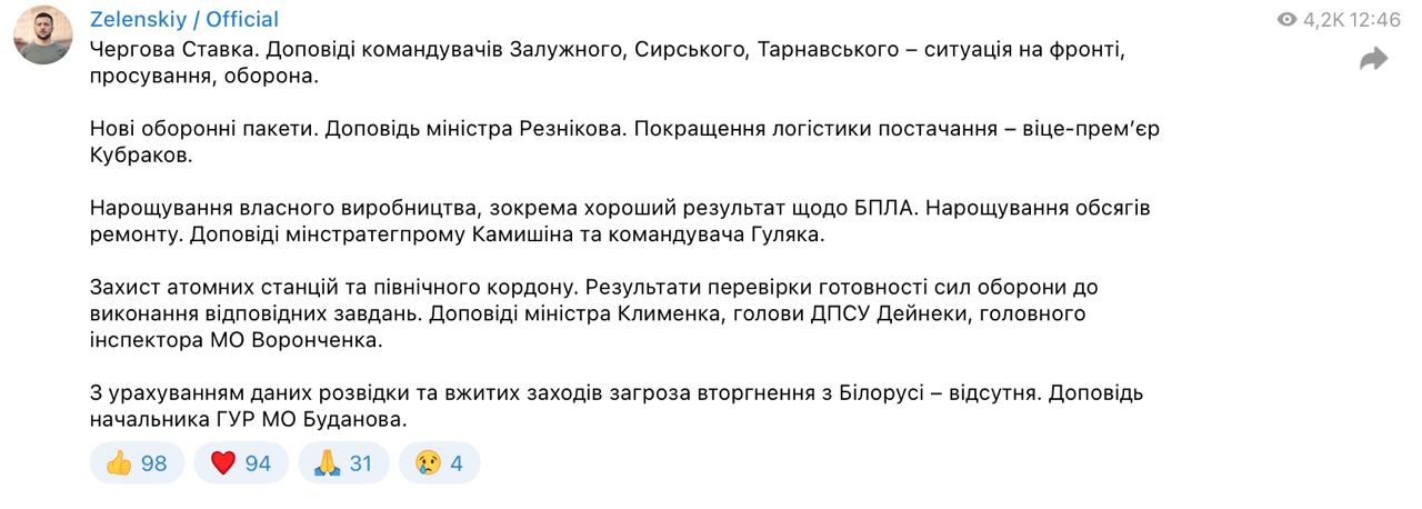 Президент України Володимир Зеленський повідомив про проведення Ставки верховного головнокомандувача. Про це він написав у Telegram.