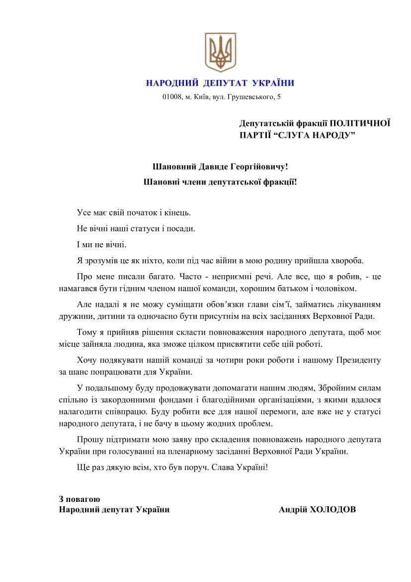 "У Верховну Раду України надійшла заява від Андрія Холодова про складання повноважень народного депутата. У свою чергу як голова партії "Слуга народу" підписала розпорядження про виключення його з партії", - написала голова партії Олена Шуляк у Фейсбуці.
