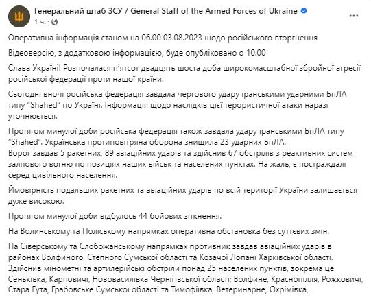 Уранці 3 серпня Генштаб ЗСУ оприлюднив зведення про ситуацію на фронті.