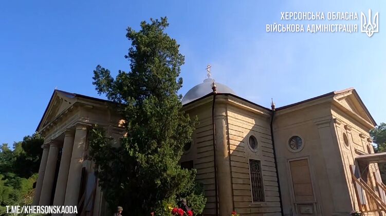 Херсонська ОВА публікує відео з наслідками ранкового обстрілу Катерининського собору у центрі міста.