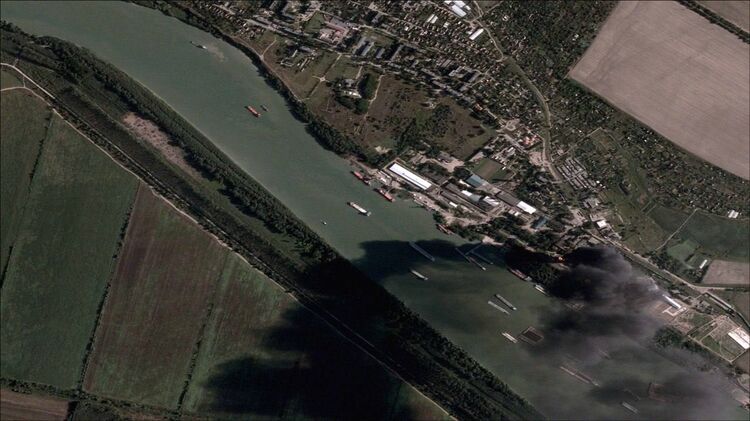 На знімку, зробленому в четвер, 3 серпня, компанією BlackSky, видно дим, що піднімається в районі порту вздовж річки Дунай в Ізмаїлі, неподалік кордону з Румунією.