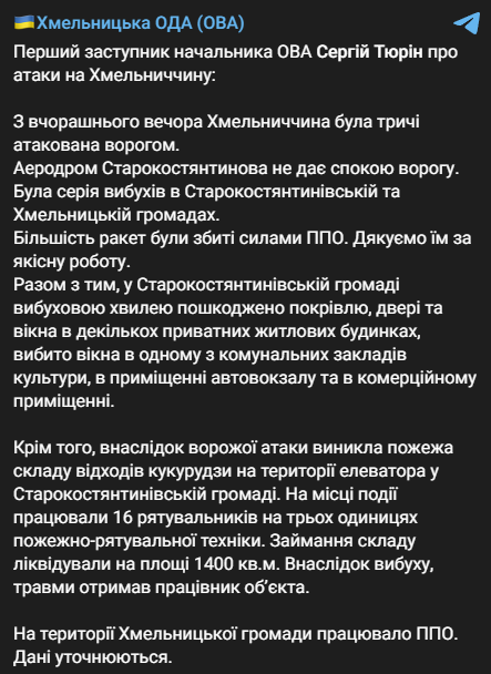 З учорашнього вечора Хмельницька область була тричі атакована російськими військами. Була серія вибухів у Старокостянтинівській та Хмельницькій громадах. Більшість ракет було збито силами ППО.