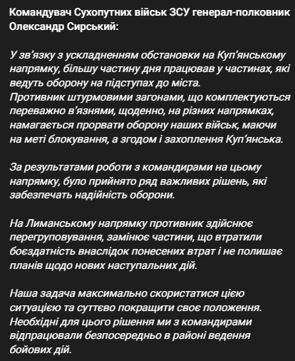 "Противник штурмовими загонами, що комплектуються переважно ув'язненими, щодня, на різних напрямках, намагається прорвати оборону наших військ, переслідуючи мету блокування, а згодом і захоплення Куп'янська", - сказав Сирський.